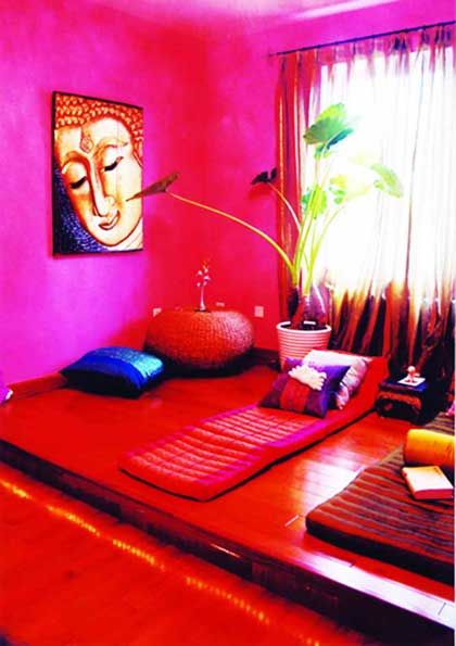 木雕佛像,燭火氳氤,薰香裊裊,煙霧繚繞,桃紅柳綠,滿眼都是濃烈的色彩,這是典型的東南亞居室。
