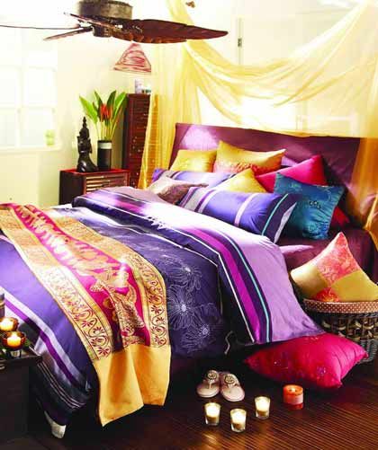 布藝嬌艷,有皺褶的質(zhì)感和垂感、抽象的花紋、嬌艷欲滴的色彩是東南亞風(fēng)情的典型標志。
