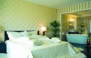 臥室 它的舒適不言自明,壁紙的顏色溫馨柔和,深淺相間,賦予空間別致的特色。純白的床飾、純白的羊毛地毯、米色的窗簾組合起來(lái),給人以無(wú)限遐想,流連其間韻味十足。