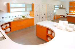 橙黃:廚房視覺整潔輕松 視覺效果是否整潔、輕松是夏季廚房設(shè)計(jì)的要害。橙色地柜、白色的臺(tái)面巧妙搭配,顯得清新飄逸,令人心曠神怡。U型臺(tái)面設(shè)計(jì)獨(dú)特時(shí)尚,更增加了操作空間。