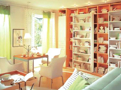 書房裝修比較的的簡單整體以白色為主,在軟裝上采用了比較時尚、亮麗的橙色做主打色。為顯出顏色的豐富性還采用了淡墨綠色的做窗簾,突出了橙色的漂亮。視覺效果很不錯,但還是不太實用,顏色過于亮麗了,書房的顏色還是要以淡色為主。