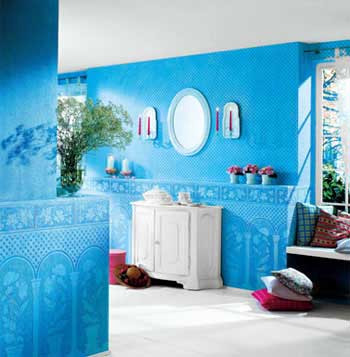 墻面上半部:整個(gè)墻面基層都是水泥,分為上下兩部分。先在整體墻面上刷一層界面劑或者環(huán)保硝基清漆封住基層,然后用膩?zhàn)庸纹?,干燥后打磨封底,再選一種環(huán)保布用膠貼到墻面上半部。