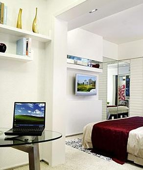 通過走廊過道明確區(qū)分了臥室的空間,開放中保留著隱蔽。蝕花玻璃引發(fā)光與影的對(duì)話,約隱約現(xiàn),欲拒還迎,香艷魅力勢(shì)不可擋,如同女性風(fēng)姿掩映,現(xiàn)在高級(jí)女白領(lǐng)外表矜持而內(nèi)心狂熱的表達(dá),讓人遐想無限??蛷d里掛上紫紅玻璃紗,如成片成片的花瓣隨風(fēng)飄落。醒目的圓角沙發(fā),時(shí)尚大方,打破傳統(tǒng)的束縛。地毯與天花的呼應(yīng),似是輕描淡寫的燈光和擺設(shè),把整個(gè)空間層次列得分明有序,而且處處凸顯了香艷時(shí)尚的性情。
