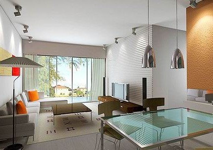 走進室內(nèi),立刻被設(shè)計師所運用的顏色所感動,清新淡雅的墻身,再配以浪漫、溫馨的紅色沙發(fā),干凈利落的設(shè)計里滲透出時尚的品位。在設(shè)計中,直線是最能體現(xiàn)簡潔與大氣的畫筆。客廳、臥室與整個居室的風(fēng)格和諧一致,或粗獷大氣或精巧細致,大大小小的矩形在不停地重復(fù)使用,將美學(xué)中的構(gòu)成學(xué)運用到室內(nèi)設(shè)計中,在簡潔中滲透出與眾不同,簡單而富有時尚個性??蛷d一角的展示柜,展示了業(yè)主酷愛的精巧飾品,體現(xiàn)了業(yè)主的喜好、點綴了客廳的一角,同時使這里更具文化氣息。