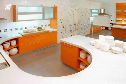 視覺效果是否整潔、輕松是春季廚房設(shè)計的關(guān)鍵。橙色地柜、白色的臺面巧妙搭配,顯得清新飄逸,令人心曠神怡。U型臺面設(shè)計獨特時尚,更增加了操作空間。
