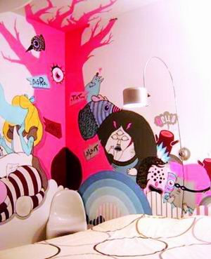 另外,涂鴉不僅僅只是拘泥于整體墻面的裝飾,可以請(qǐng)涂鴉畫師根據(jù)室內(nèi)的家具風(fēng)格設(shè)計(jì)一種涂鴉造型,然后把這種造型形式統(tǒng)一運(yùn)用的家裝中的各個(gè)方面。