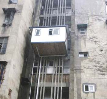 被稱為“史上最牛的廚房”懸身于青山116街坊22棟7單元5樓外墻上。27日下午2時(shí)許,記者在樓下看到,該廚房依靠?jī)筛崩娜卿摵附釉谖鍢琼敶皸U上,廚房是用活動(dòng)板和鐵皮做的,長(zhǎng)約3米,寬約2米,高約2米。閣樓外墻上開有兩扇小窗,其中一扇有抽油煙機(jī)排氣管。該樓有7層,僅5樓外墻建了廚房。遠(yuǎn)遠(yuǎn)看去,在平整的樓房外墻映襯下,顯得格外突出。