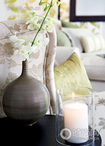 布藝沙發(fā)也同樣遵循了花色與純色混搭的原則,奶白色的雙人沙發(fā)用淺灰綠的靠包來點綴,分坐兩旁的單人沙發(fā)則使用枝葉與花朵的暗紋來處理,旁邊配上深色的小茶幾,精致的圓肚細(xì)頸花瓶里悄悄探出一枝素雅的白色蝴蝶蘭,跟玻璃罩內(nèi)點燃的白色蠟燭相映成趣。