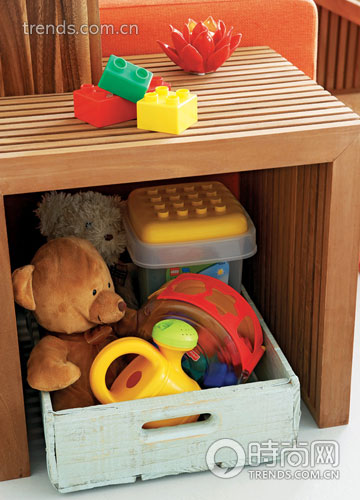 紅色單人轉(zhuǎn)椅跟外面的紅色圓頂鏤空沙發(fā)相配,自然而親切。橘色的拐角沙發(fā)線條干凈利索,上面擺放著玩具熊和各色靠包,玩具熊貓坐著的兩把小椅子和茶幾一側(cè)的小木馬,無一不透露著孩童的可愛。條紋茶幾和小柜子都選取原木材質(zhì),不論是茶幾上的珠算、小柜子下面收納的各式玩具,還是木質(zhì)方花瓶中垂落下的紅綠相間的枝葉,全都非常貼合房間諧趣歡快的主題風(fēng)格。