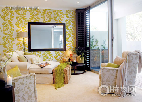 墻壁大面積使用黑底白紋的圖案,給地板留出足夠簡潔的空間。沙發(fā)上方做出的原木架將發(fā)散的目光重新聚集,照片擺在一側(cè),圓扁的小蠟燭悄悄亮起,讓氣氛一下活躍起來。水晶吊燈線條優(yōu)美,外面籠罩了一層黑色豎紋裝飾,與沙發(fā)前純黑的地毯遙遙相望,而躺椅完美的弧度在提供給主人充足的休息之余,也配合著前兩者成為屋內(nèi)最為深暗的色彩之一。橫排的白色沙發(fā)顯露出十足的貴族氣息,高高豎在一側(cè)的地?zé)粢蚕鄳?yīng)地做出漂亮的大花圖案,亮燈時花朵若隱若現(xiàn),朦朧之美呼之欲出。
