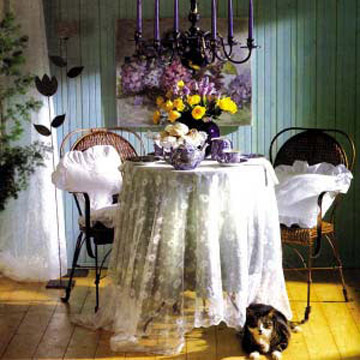 餐廳和居室用蕾絲裝飾后,看起來(lái)明快活潑,還很漂亮。窗簾如果遇到蕾絲,就會(huì)擁有變身的能量,當(dāng)日光掠過(guò),花邊會(huì)形成跳躍的影子穿過(guò)房間。漂亮的蕾絲花邊,還可以裝飾窗簾掛鉤,此外,它也可以用來(lái)保護(hù)光滑的木制表面。