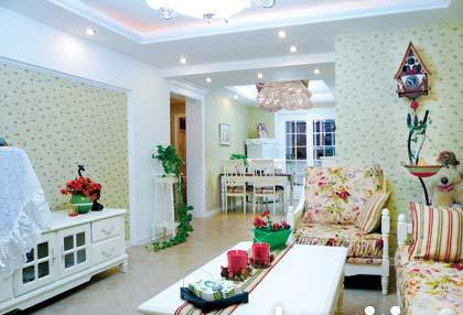 客廳的沙發(fā)是時下很流行的布藝與實木結(jié)合的款式,大花朵布藝與白色外框搭配很大氣。電視柜、鞋柜、茶幾、餐桌椅,每一件家具都是白色的,用花瓶、桌旗等飾品進(jìn)行點綴,顯得既整潔又不呆板。