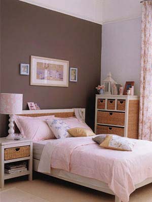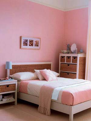 粉紅色的墻面定下整體基調(diào),給人以朦朧的浪漫感覺(jué)?;野咨蛎靥?,以及白色窗簾與粉紅色過(guò)度十分自然。白色的床邊小桌和柜子仍然帶藤制抽屜,桌上放有藍(lán)色托盤(pán)和藍(lán)色臺(tái)燈,是整體色調(diào)中活潑的一筆,柜子上飾以小圓鏡、藍(lán)色花瓶和小花枝。灰白色的床上覆以粉紅色的床罩,白色床單、白色枕頭、藍(lán)、粉色小靠墊,溫暖而舒適。