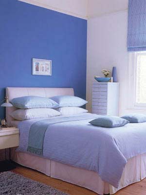 主題墻面為色彩鮮明的水藍(lán)色,墻壁正中是白色小像框,其余墻壁采用灰色,很好地襯托了主墻面。床上鋪以白色床單和藍(lán)色薄被以及藍(lán)色枕頭,床邊柜上擺有藍(lán)色托盤(pán)和藍(lán)色花瓶,繼續(xù)強(qiáng)化主題色調(diào)。總體感覺(jué)藍(lán)色灄人心魄,其余色調(diào)的搭配是對(duì)這種感覺(jué)的提升。