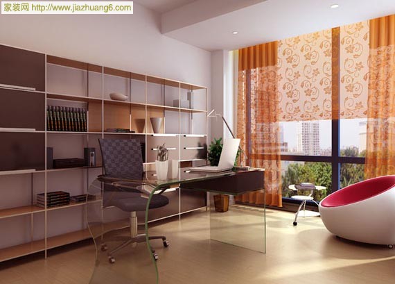 書(shū)房的色彩力求穩(wěn)重、優(yōu)雅,設(shè)計(jì)時(shí)最好能與使用者的性格、年齡一并考慮,使整體色調(diào)寧?kù)o而舒爽。窗簾的配置亦很重要,一般以選用既能遮光,又有通透感覺(jué)的淺色紗簾比較合適。強(qiáng)烈的日照通過(guò)窗幔折射變得溫婉、柔和,使眼睛免受光線的直接刺激。