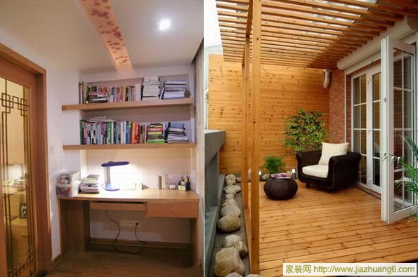 將陽臺用玻璃和木材封閉成居家小書房,窗外的綠葉仿佛伸手可及,好像馬上就會進(jìn)入居室,自然與居室就這樣在陽臺這個小小空間相交融。為了節(jié)約空間,可將書桌、書架和文件柜都設(shè)計得很小巧別致,既提供了完善的實用功能,又不多占空間。