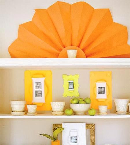 這把用橘黃色厚紙做的折疊紙扇仿佛日出東方,可以將它置于書架、壁爐架或門上。