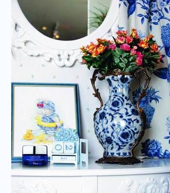 青花圖案花瓶擺放在白色雕花邊桌上,視覺(jué)上十分協(xié)調(diào)。這個(gè)區(qū)域內(nèi)的其他飾品也都選用了藍(lán)白兩色,增加整體和諧感。