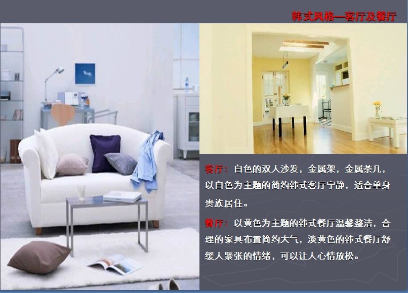 概要: 韓式裝修風(fēng)格大盤(pán)點(diǎn)韓式裝修風(fēng)格大盤(pán)點(diǎn) 韓式田園風(fēng)格可能是大多數(shù)年輕女孩比較喜歡的噢,它的重要元素是色調(diào)以柔和浪漫的粉色為主,浪漫的蕾絲、綠色植物、經(jīng)典的白色家具、隨處可見(jiàn)的卡通娃娃、毛絨地毯等裝飾?! 】蛷d:白色的雙人沙發(fā),金屬架,金屬茶幾,以白色為主題的簡(jiǎn)約韓式客廳寧?kù)o,適合單身貴族居住。