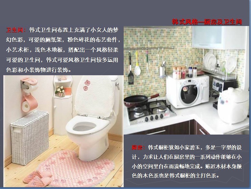 衛(wèi)生間:韓式衛(wèi)生間布置上充滿了小女人的夢(mèng)幻色彩,可愛(ài)的廁紙架,粉色碎花的布藝套件,小藝術(shù)柜,淺色木地板,搭配出一個(gè)風(fēng)格輕柔可愛(ài)的衛(wèi)生間,韓式可愛(ài)風(fēng)格衛(wèi)生間較多運(yùn)用色彩和小裝飾物進(jìn)行裝飾。