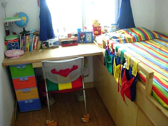 兒童房寬2米2,長(zhǎng)2米4。只能放一張書桌一張床。所以做了一張高床,床下空間可以放玩具和女兒自己的衣物。女兒和來(lái)玩的小朋友都很喜歡這張床。