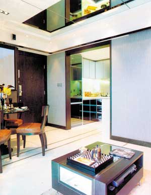 概要: 這是一套面積不大的住宅,總共才65平方米,但是設(shè)計(jì)師巧妙劃分空間,采用開放式布局,以深色作主調(diào),大量運(yùn)用鏡面,令空間呈現(xiàn)的面積比實(shí)際面積增大許多。沙發(fā)后墻懸掛起一幅清雅的飾畫,令鏡面不會(huì)顯得單一 以天然質(zhì)感的石、木及鏡子等主要物料,營(yíng)造出時(shí)尚的生活品位??蛷d和餐廳以銀箔紙皮石及白色地臺(tái)相間,設(shè)計(jì)極具氣派。天花鑲嵌鏡面。