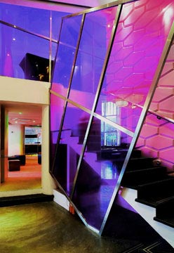 折線與金屬展現(xiàn)出的是設(shè)計師十足的個性與嫻熟的空間把握能力。鮮艷的紫色玻璃足以調(diào)動人們的視覺神經(jīng)。