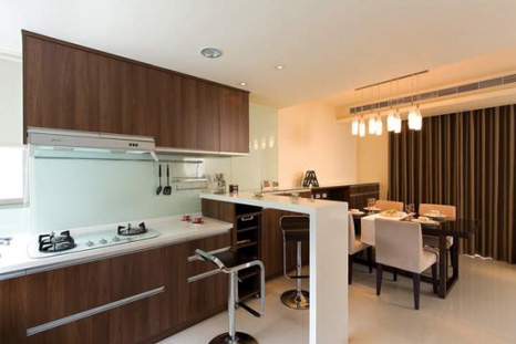 另外,廚房中總有些小角落,折疊或長度可調(diào)節(jié)的連柜餐桌可以充分利用這些小角落,而且上面做餐臺(tái),下面還可以做推拉式高柜,這種儲(chǔ)藏能力很強(qiáng)的柜體大大減少了對空間的需求。如果是開放式廚房,將料理臺(tái)延伸出來做成小酒吧也是不錯(cuò)的構(gòu)思。