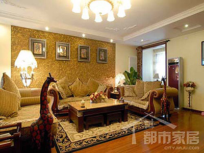 在硬裝方面,設(shè)計(jì)師僅僅是做了一層簡(jiǎn)潔的吊頂來(lái)表現(xiàn)歐式風(fēng)格而已,歐式風(fēng)格還是主要靠軟裝來(lái)表現(xiàn):家具、燈飾,以及暗金色的壁紙背景墻都非常符合歐式的主題。顏色上的高度協(xié)調(diào)使得客廳的整體效果渾然一體,主題明確。