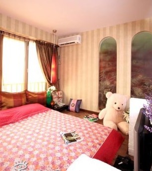 從這個方向看臥室,豎條紋墻紙設(shè)計,今年很流行,臥室的紅綠色對比比較少