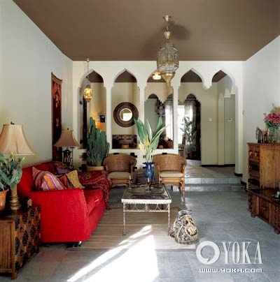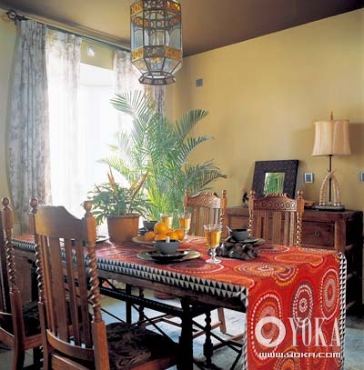 墻面上大地色系的赭石、土黃,取代了非洲土著的茅草泥坯房的天然景象。客廳、餐廳、玄關(guān)處的埡口形同清真寺的剪影。餐布上扎染的圓形圖案,仿佛是為了不辜負(fù)非洲那“太陽(yáng)之子”的盛名而傳遞熱烈的驕陽(yáng)。銅制打花的玻璃燈,是房間里最奢侈的一項(xiàng)開支,卻也是讓人翹首贊美的點(diǎn)睛。被噴燈火燒火燎過的松木門,終于熬過了“酷刑”,有了笑看風(fēng)云的脫俗氣度。