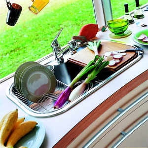 與臺面融為一體,一次沖壓成型看不到任何接縫。圓形的水盆是時下最流行的設(shè)計,適合古典和現(xiàn)代的廚房風(fēng)格,同時可以與圓形燃?xì)庠畲钆涫褂茫宫F(xiàn)廚房整體風(fēng)格。值得一提的是,與方形水盆相比,同樣的容積圓形水盆占地更小。