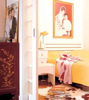 雖然這種布局不夠通透,但這些分隔都是適合現(xiàn)在生活狀態(tài)的必然選擇。白色家具配合黃、紅、棕色的點綴,營造出濃濃的新婚氣氛和溫馨感。