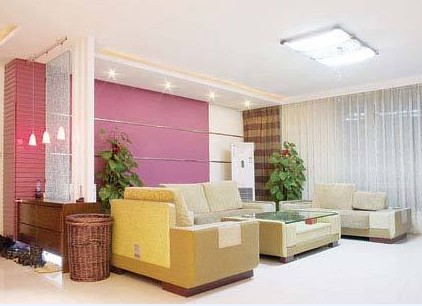 紫色背景墻最常用的地方是沙發(fā)背景墻。用紫色壁紙大面積鋪帖,只在柜式空調(diào)的后面留出相應的白色部分,再用銀色金屬條橫著粘貼在壁紙上,既能保證整體色調(diào)的完整,又不會死板,而且銀色也是一種很高檔的顏色,整體看來很有品位。值得注意的是家具一定要選擇淺色的,不然客廳就會顯得很暗。