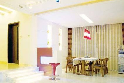 解決了玄關的問題,再看餐廳。因為主生活區(qū)比餐廳地面高,需要設計一個小臺階。如果臺階孤零零地放在餐廳與客廳之間顯得很礙眼,而緊挨著它在餐廳一側(cè)設計一個只有半墻高的小吧臺問題就解決了。放一把紫色的吧臺椅在那里,又一個休閑區(qū)就形成了。