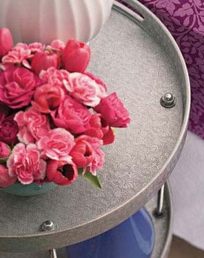 三個(gè)托盤、一些五金零件就能組成一張床頭桌!到五金商店購買4根90厘米長的金屬桿、24個(gè)墊圈、20個(gè)螺母、8個(gè)螺帽。在托盤上等距離鉆孔,注意每只托盤上的鉆孔要能對得上。將托盤組裝到一起并固定牢,在支撐桿頂部與底部加螺帽。銀色小桌是床頭的亮點(diǎn)搭配,書籍、鮮花、臺(tái)燈各居其位,時(shí)尚又實(shí)用。