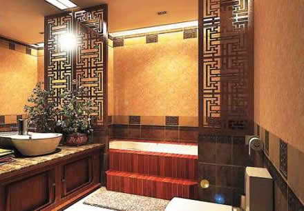 對于那些既喜歡“中國風”,但又不想把衛(wèi)浴設計成純粹中式的,可以選擇歐式仿古瓷磚。比如金意陶瓷磚就很典型。還要注重局部裝飾,燈飾、浴室柜等的選擇可以偏新亞洲。