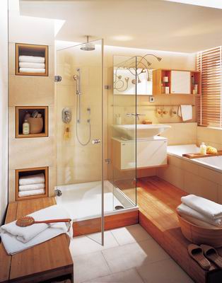 三要素定色屬于暖色系的紅、黃、橙,令人溫暖、喜悅,同時使空間感覺變小,而藍(lán)、綠等冷色系的顏色令人感覺寒冷、冷靜,使空間感覺較寬敞;另外,彩度及明度較高的色彩可塑造空間的寬敞,反之則使空間有穩(wěn)重感。除了色彩本身,照明效果就象色彩的“魔術(shù)師”,相同的顏色常因不同的光線亮度,在視覺上產(chǎn)生差異。因此,為衛(wèi)生間選擇色調(diào)前,應(yīng)綜合考慮以上三要素。