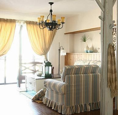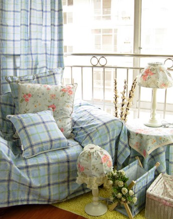 在室內(nèi),窗簾、桌巾、沙發(fā)套、燈罩等均以低彩度色調(diào)和棉織品為主。素雅的小細(xì)花條紋格子圖案是主要風(fēng)格。