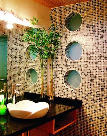 布局:幾何主義衛(wèi)浴間非常適合小面積衛(wèi)浴,爽朗的線條可以拉伸空間視覺感,采用深色系的墻地磚不僅耐臟,也能讓空間顯得大方、敞亮。這類衛(wèi)浴間中的布局要求簡單,除了基本的面盆、潔具外,沐浴區(qū)最好采用淋浴房,標準規(guī)格的淋浴房面積一般在90cm×90cm以上,能保證沐浴時肢體有足夠的空間進行伸展。選用圓形淋浴房可以相對節(jié)省空間,如果帶有儲物柜則更加理想,可以將洗浴用品一一陳列,讓空間顯得更加整潔。
