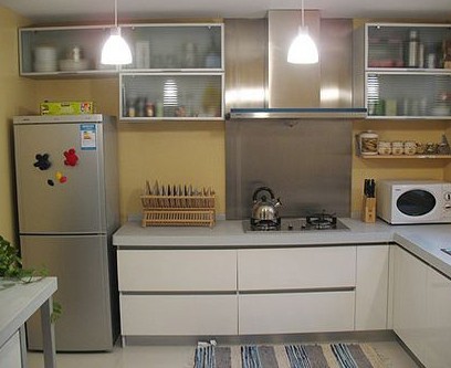 圖一中的廚房就是通過局部重色的點綴,然后配比大面積的淺色系地磚,讓居室空間看上去高挑但又不失重點,葉國密說,開放式廚房的頂面采用磨光的黑色石材,表面光滑如鏡,能夠反射居室光線,與高亮度地磚形成強烈對比,這種方式不僅可以在開放式廚房中使用,對于小戶型的吊頂也不失為一種劍走偏鋒的方式。