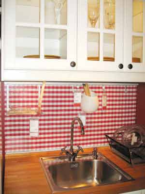 這個(gè)廚房樣板間的灶臺(tái)與吊柜之間區(qū)域是紅方格圖案,該圖案并非是瓷磚,這讓記者感到新奇,因?yàn)榇蠖鄶?shù)人家的廚房此區(qū)域裝修都采用瓷磚處理,這是什么新材料呢?走近一看才知道,這是用玻璃裝飾的,玻璃里面襯上了紅方格布。