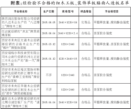 西安市質(zhì)監(jiān)局本次從部分銷售細(xì)木工板、裝飾單板貼面人造板的經(jīng)銷企業(yè)共抽查了23家受檢單位的37個(gè)生產(chǎn)企業(yè)的40個(gè)批次的樣品,合格率為60%。其中,細(xì)木工板合格率為77.27%;裝飾單板貼面人造板合格率為38.89%。在家世界、安美居、旺家旺等經(jīng)銷建材的超市抽樣檢查合格率為78.57%;在建材市場的抽樣檢查合格率為50%,這表明建材超市的產(chǎn)品質(zhì)量,優(yōu)于建材集貿(mào)市場的產(chǎn)品質(zhì)量。