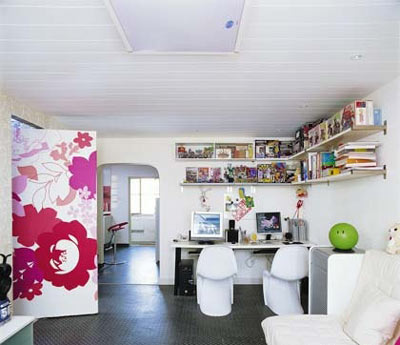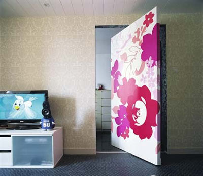首先是那道神秘的大門,它的艷麗、獨特、趣味,讓我們不得不一再驚嘆楊賽文的創(chuàng)意。楊賽文說,這道大門的靈感來自于日本偵探漫畫中的一集:《密室案件》。一扇轉(zhuǎn)門,隱于墻中,輕推旋轉(zhuǎn),兩個世界。這道大門是連接臥室與客廳的重要環(huán)節(jié)。因為門的尺寸太大,而旋轉(zhuǎn)門又涉及太多復(fù)雜的物理原理,加之大門的旋轉(zhuǎn)轉(zhuǎn)軸,及用做固定大門用的隱形磁鐵安裝等等,都成了裝修時的棘手問題。