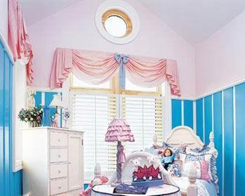 兒童房的裝飾重點(diǎn)應(yīng)該是表現(xiàn)孩子的天真活潑,在藍(lán)白相間的條紋墻裙上加入柔美的粉紅色,整個(gè)房間立刻變得溫馨可愛(ài)。床上用品、桌布和窗簾的各個(gè)細(xì)節(jié)搭配與墻面的顏色非常統(tǒng)一,更讓這小小的空間成為一絲不茍的完美境界。