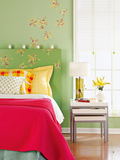 床頭的背景墻和床頭板都是純綠色,色度不一樣,可在建材賣場或網(wǎng)上購買墻貼,挑選跟綠背景顏色呼應的花朵圖案最能展現(xiàn)春的氣息。而且背景墻和背板選擇一致的圖案,統(tǒng)一性會使裝飾更顯協(xié)調(diào)。