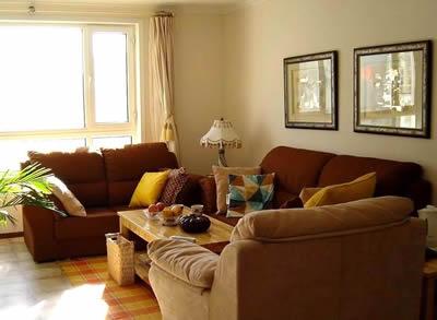 客廳是家中最寬敞明亮的空間了,色調(diào)沿用了整個(gè)房屋所采用的中性暖色系。墻漆是淡淡的粉橙色,頂是乳白色,門也是乳白色。除了門廳的主題墻,我家所有墻漆都是來(lái)威漆,顏色正,亞光的質(zhì)感也不錯(cuò),后來(lái)我才知道,宜家的樣板間也全部用這個(gè)牌子的漆。整個(gè)客廳的用色曾被我形容為“牛奶+咖啡”,用在沙發(fā)上是最貼切的。沙發(fā)是北京的老品牌宏遠(yuǎn)山水,很墩實(shí)耐用,具有美式風(fēng)格典型的寬大舒適,靠背比一般沙發(fā)要高,老公最喜歡這種坐上就陷進(jìn)去的感覺,款式是他拍的板。茶幾和沙發(fā)邊桌是在建材超市選的質(zhì)量好的集成材,木工師傅根據(jù)我的要求打制的,本想要個(gè)方形的,可沒(méi)有寬度合適的集成材,留下了一點(diǎn)遺憾。