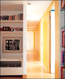 說到走廊裝飾,得提到一個“占天不占地”的原則,因?yàn)樽呃妊b飾的美觀主要反映在墻飾上。在走廊的墻壁上,可以采用與居室顏色相同的乳膠漆或壁紙。如果走廊溝通的兩個空間色彩不同,原則上走廊墻壁的色彩與面積大的空間相同。