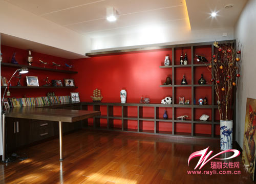 寬敞的會客區(qū),也是陳列區(qū),木質(zhì)擱架,讓整體空間有一種沉穩(wěn)的感覺。