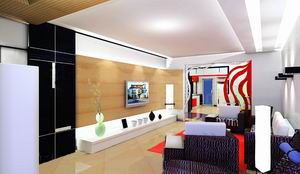 設(shè)計解說:現(xiàn)代主義的平板電視墻一般不采用過多的修飾,墻面多使用簡潔的色彩作為裝飾,可設(shè)置一個低矮的柜子作為置物之用,并可在矮柜上擺放具有現(xiàn)代設(shè)計感的裝飾物。搭配上可與整體的沙發(fā)、后墻以及隔斷相配合。一般面積較小的居室里適合現(xiàn)代風(fēng)格的裝飾。